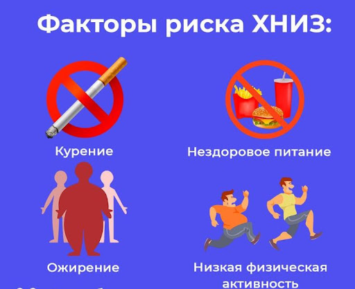 50% вклада в развитие неинфекционных заболеваний вносят основные 7 факторов риска: курение, нездоровое питание, низкая физическая активность, высокое потребление алкоголя, повышенный уровень артериального давления, повышенный уровень холестерина в крови, ожирение.